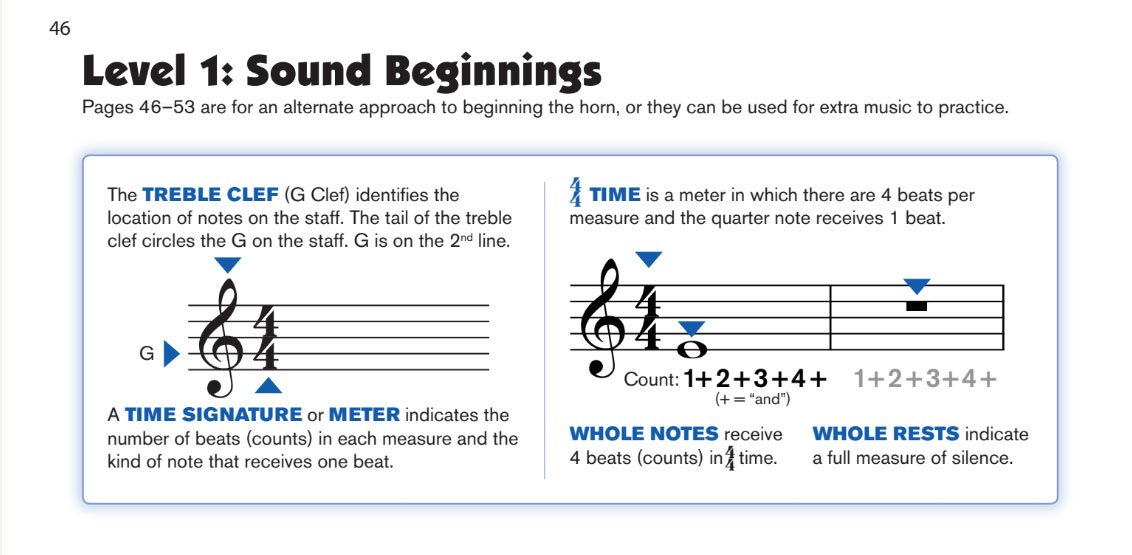 An alternate approach pages to beginning horn in F and oboe are located in the back of the book for clear and easy access.